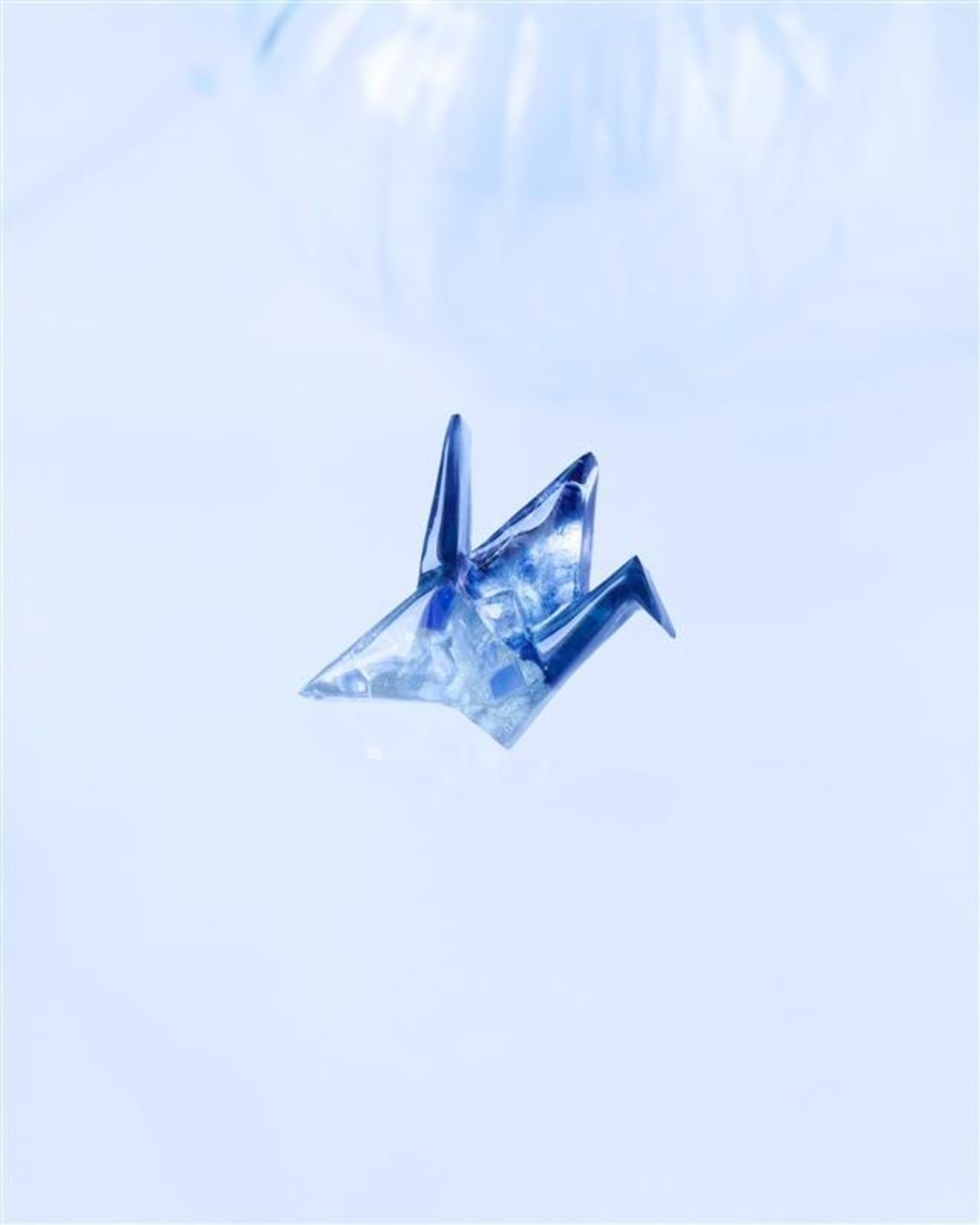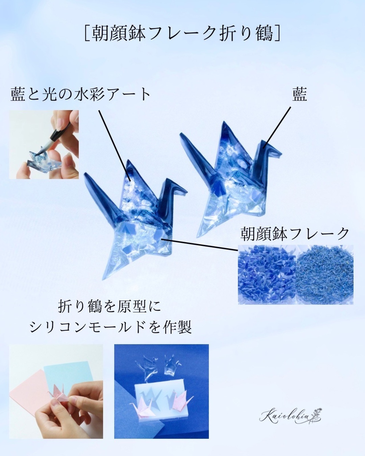 使用済朝顔プラスチック鉢 粉砕時の粉を、折り鶴形状のレジンピンバッチに封入しました。